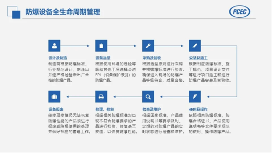 防爆設備管理應遵從設備全生命周期管理模式。設備全生命周期管理是指設備從規劃、生產、選型、收購、裝置、運用、保護、查看、檢修、終究作廢亦或收回再利用的全生命周期中的信息與進程。